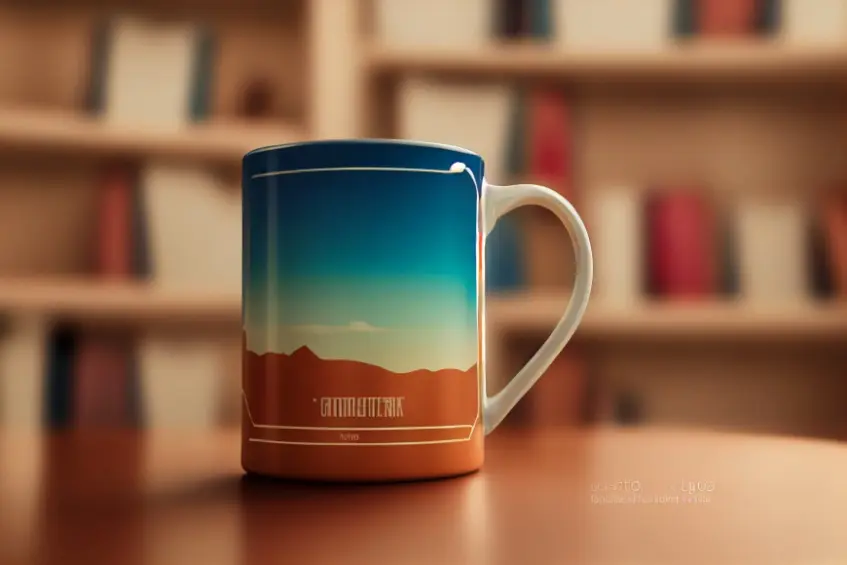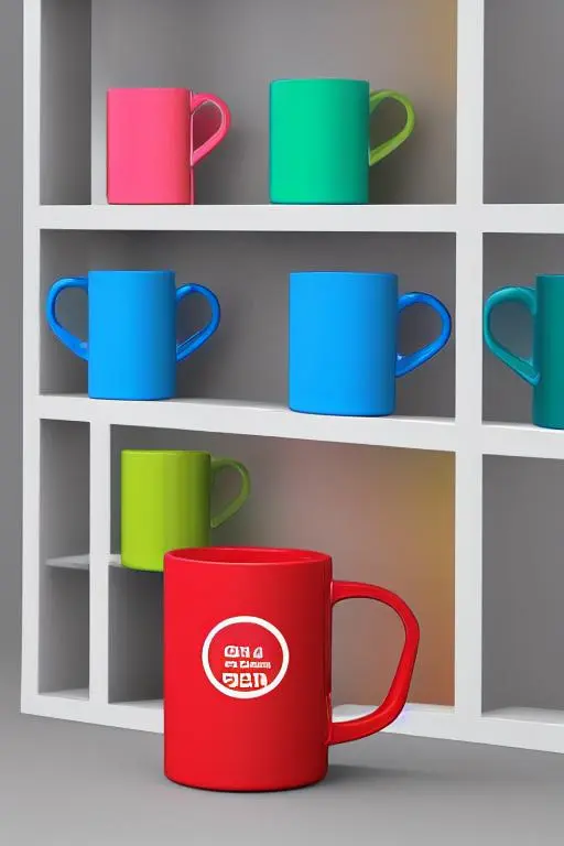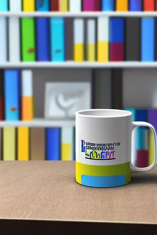 “Promotional Mug with logo on a bookshelf, ceramic, stoneware, porcelain, colourful office background with transparent windows , 3D, render, photorealistic, detailed, high definition, 4k, –ar 16:9”